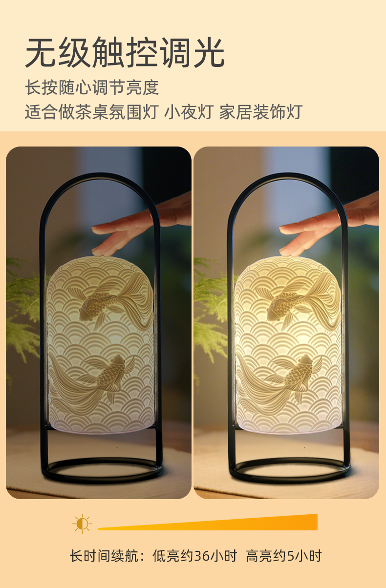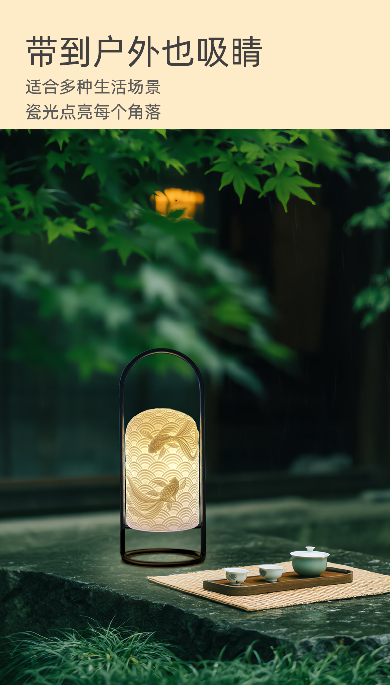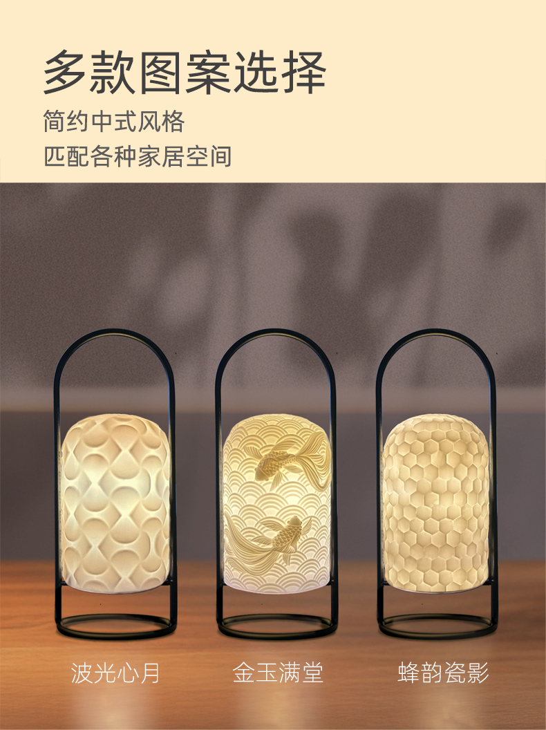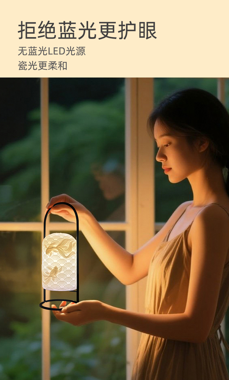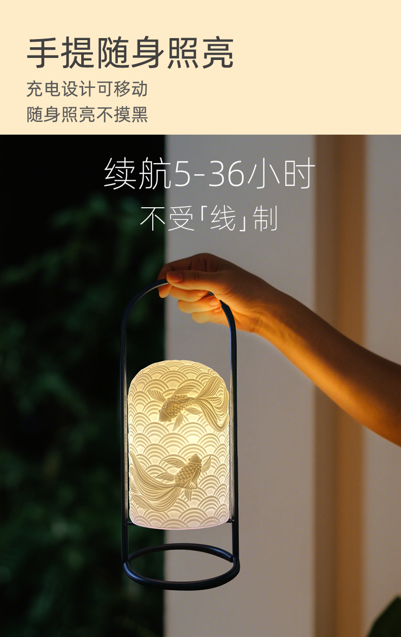 This non-heritage ceramic lamp is made of white porcelain, features USB charging, and offers stepless dimming. Its handle is made of iron, making it portable. The lamp is blue-light-free and flicker-free, serving as an eye-protecting light.