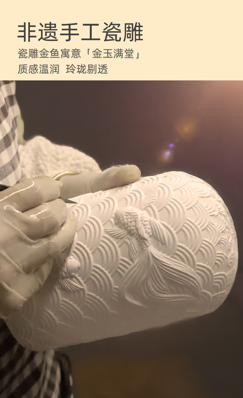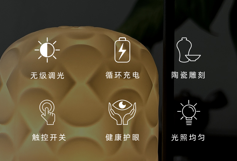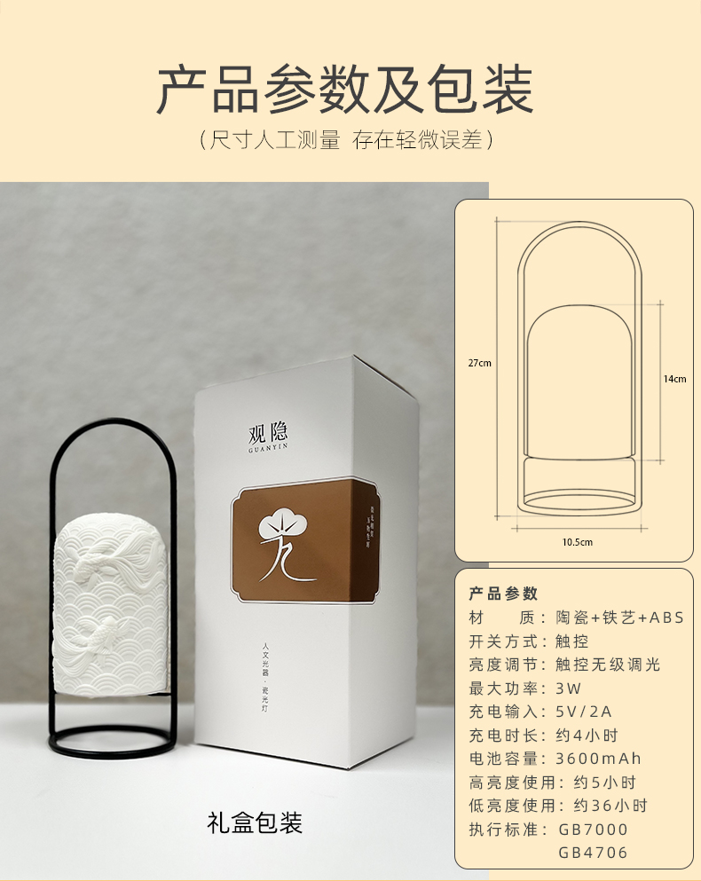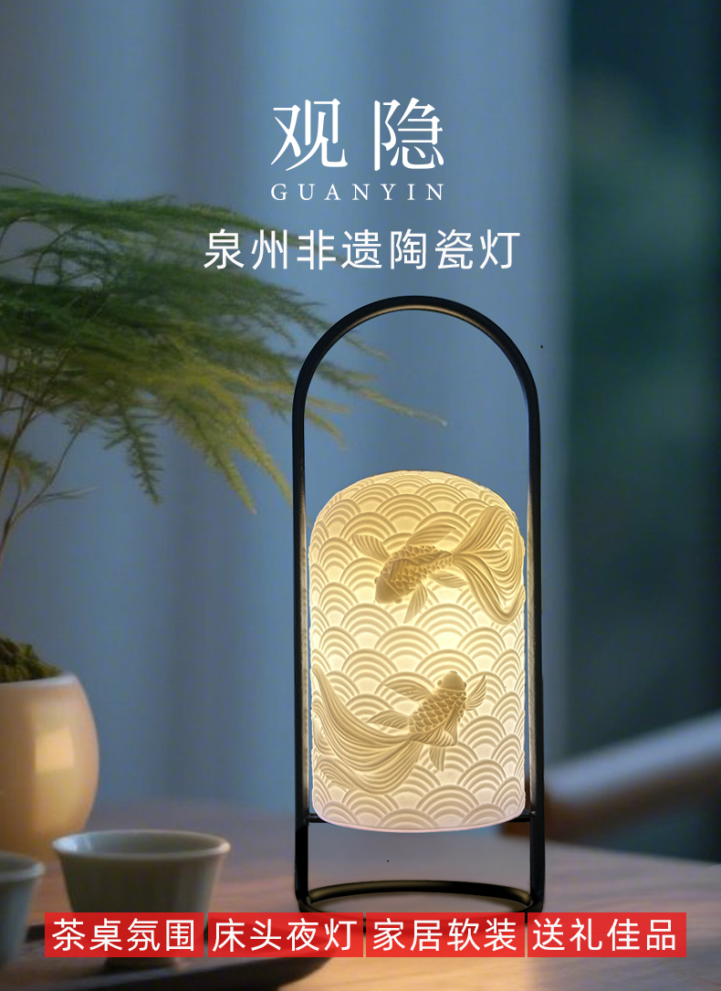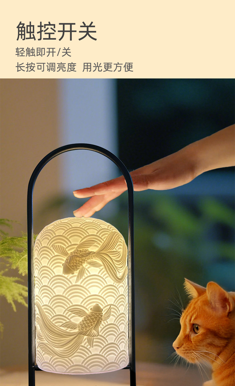 This non-heritage ceramic lamp is made of white porcelain, features USB charging, and offers stepless dimming. Its handle is made of iron, making it portable. The lamp is blue-light-free and flicker-free, serving as an eye-protecting light.