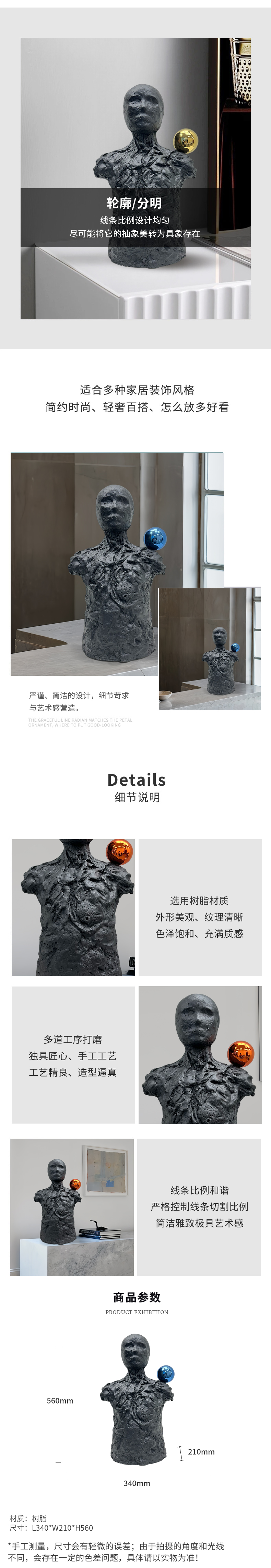 An abstract art human figure made of resin, with blurred facial contours, rough textured wrinkles, and a coarse rocky feel; the torso texture is uneven, as if eroded by time, both arms are incomplete, and a bright blue reflective sphere is embedded in the right shoulder.