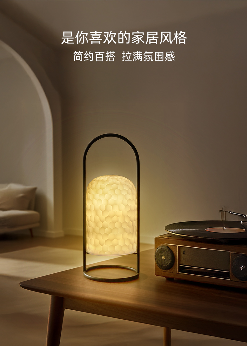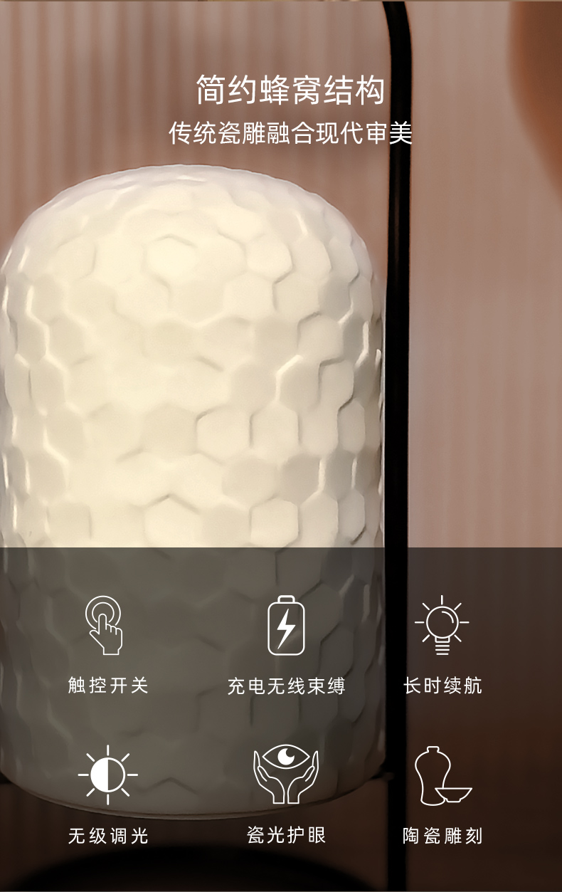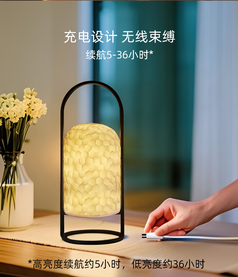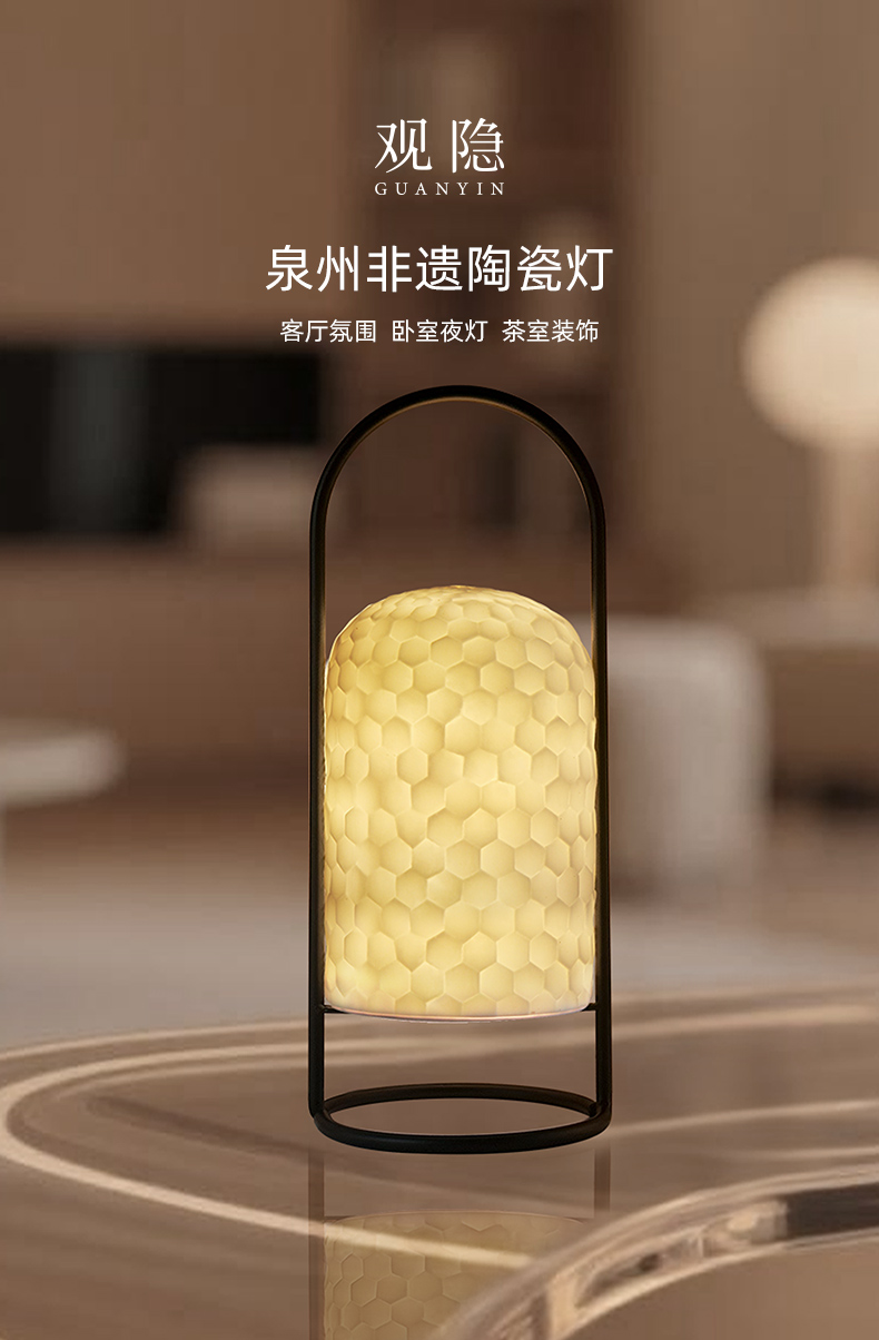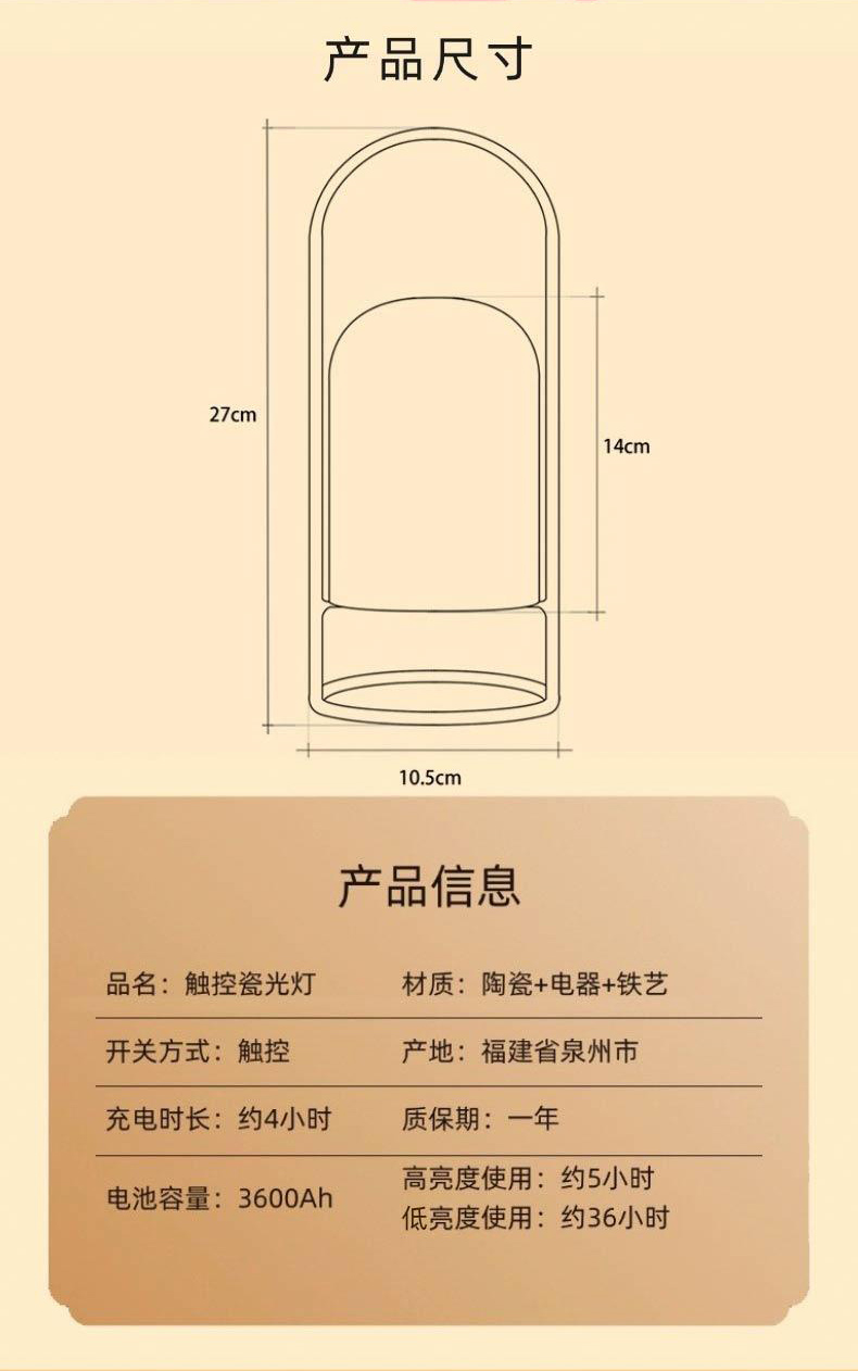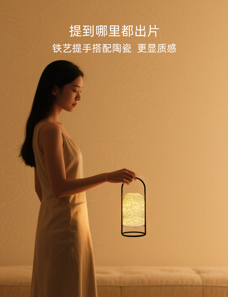 This non-heritage ceramic lamp is made of white porcelain, features USB charging, and offers stepless dimming. Its handle is made of iron, making it portable. The lamp is blue-light-free and flicker-free, serving as an eye-protecting light.