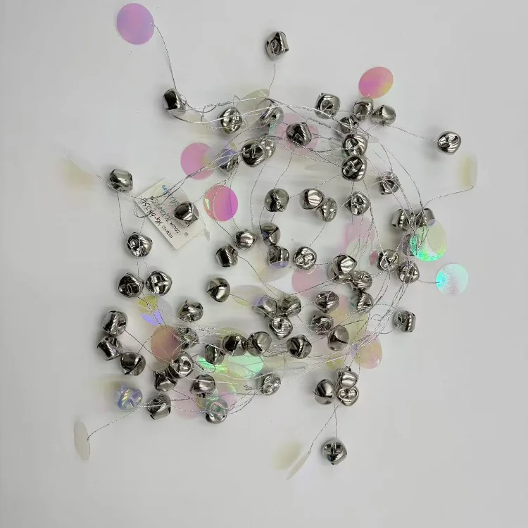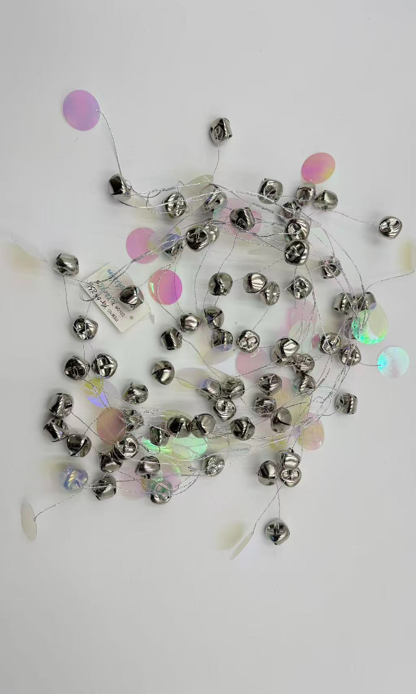 Measuring 3 meters in total length with built-in hanging rings, this product can be used as a wind chime and is colorfast. The combination of silver bells and iridescent holographic sequins creates a dazzling display of colors from every angle under both sunlight and artificial light. When the wind blows, the bells produce a clear, crisp sound.