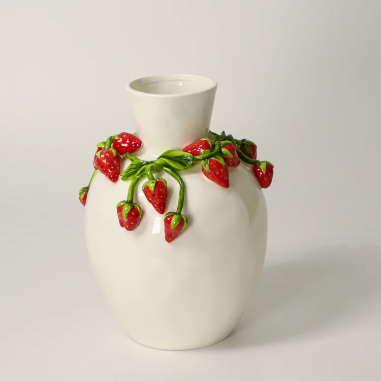 This ceramic vase is based on pure white porcelain. The neck is decorated with three-dimensional floating patterns of strawberries and vines. The red fruits and green leaves are vividly depicted, with bright and lively colors. The bottle's lines are smooth and round, and the glaze is smooth and fine. It combines artistic appeal with practicality. It can be used as a flower container to hold flowers, or as a tabletop ornament, injecting a sweet and fresh atmosphere into the living space. It is a
